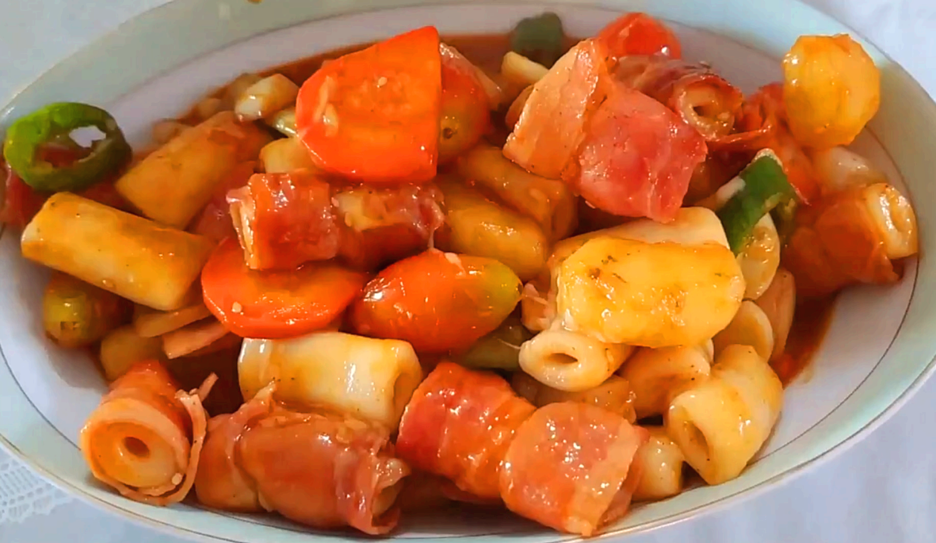 감자, 베이컨, 떡, 소금, 방울토마토, 고추, 대파, 양파, 당근, 마늘, 간장, 맛술, 케첩, 고추장, 설탕, 매실청, 체다치즈가루, 깨소금, 참기름, 이쑤시개