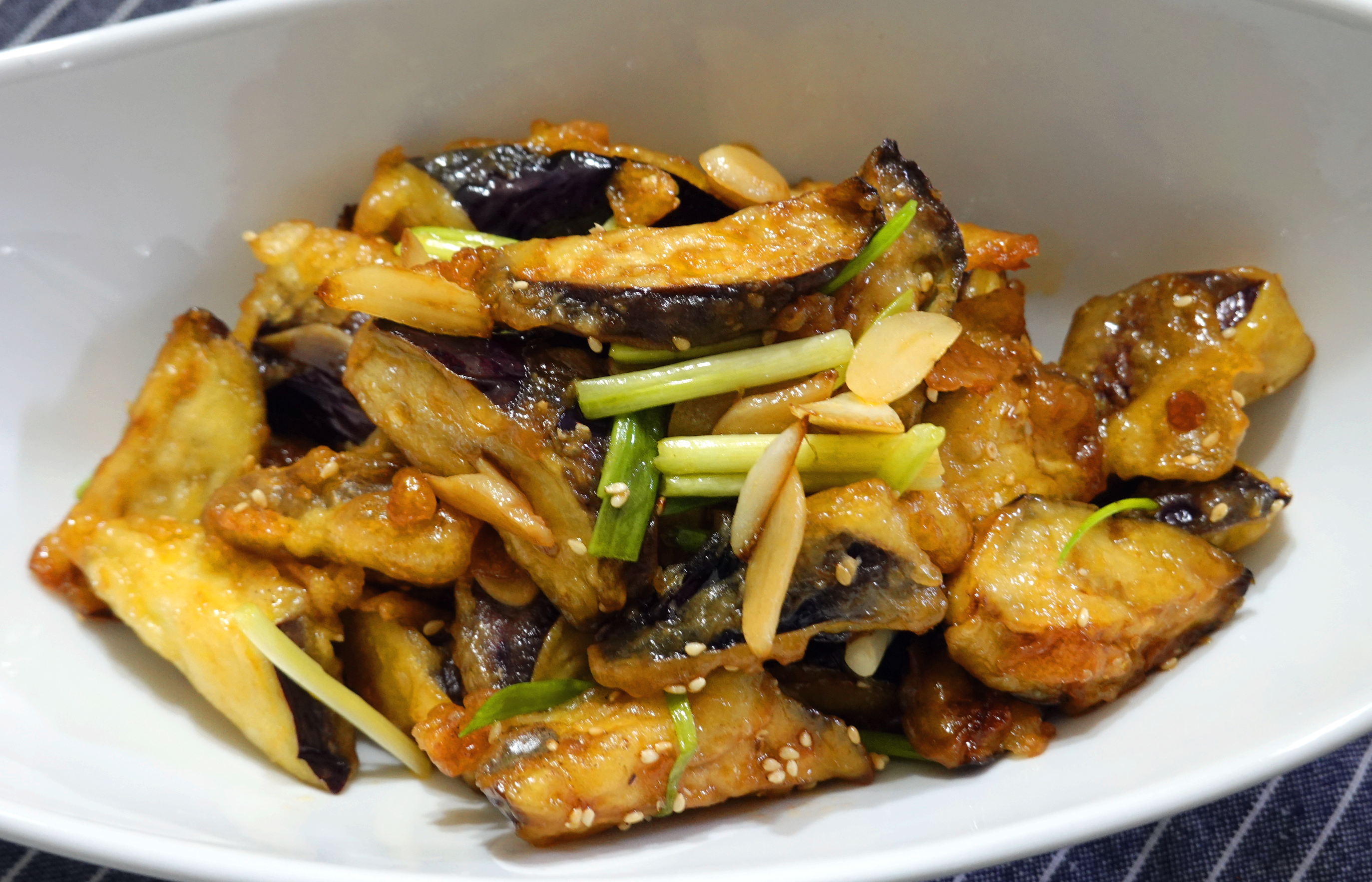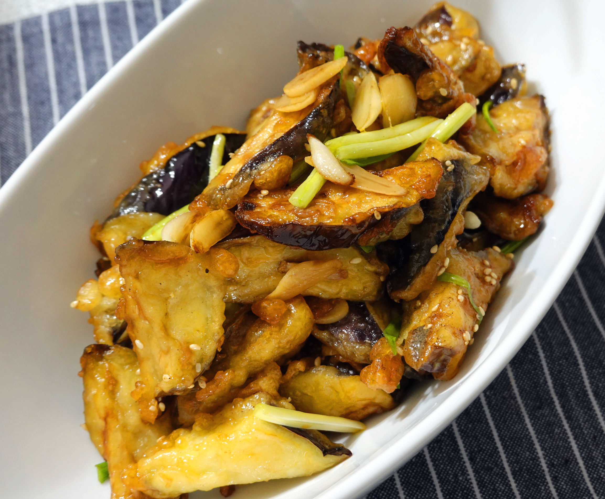 7) 탕수 소스에 2번 튀겨놓은 가지를 넣고 버무린 다음, 쪽파와 후추, 깨소금, 참기름을 넣고 마무리해주면 가지 튀김이 완성된다.