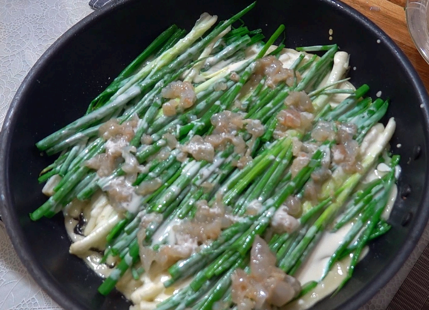 6) 반죽을 쪽파 위에 올린 다음, 준비한 새우를 고명으로 올리고 3분 정도 익힌 후 뒤집어주세요.