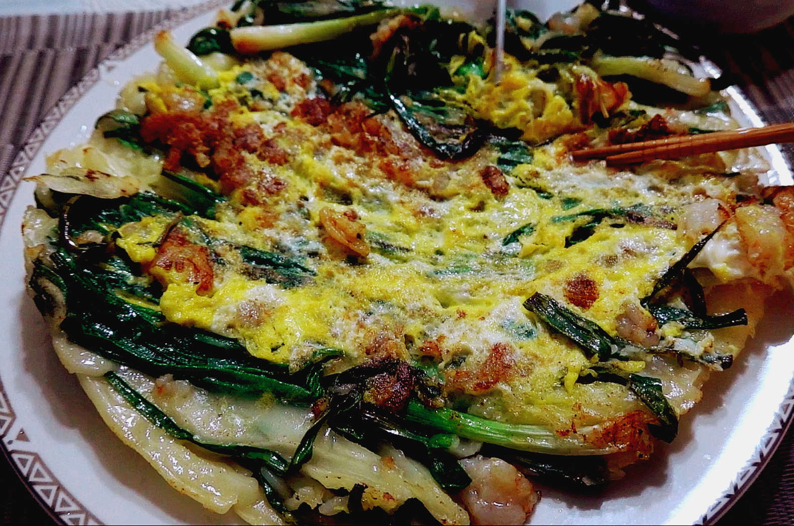 7) 거의 다 익을 때쯤 다시 파전을 뒤집어 줍니다. 그다음 달걀을 파전 위에 올려서 노른자를 풀어주세요.